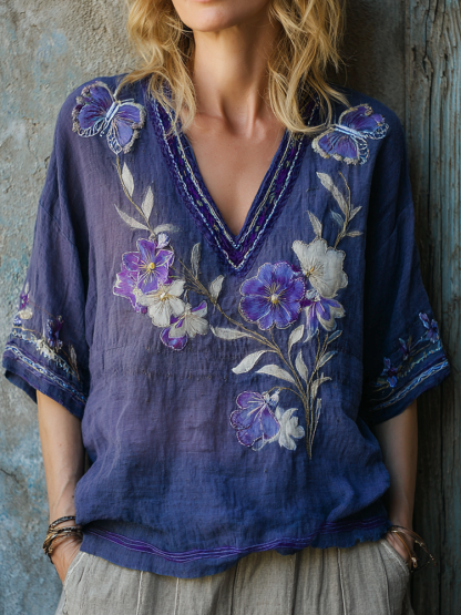 Women's Vintage Floral Embroidery Art V Neck Linen Comfy T-shirt