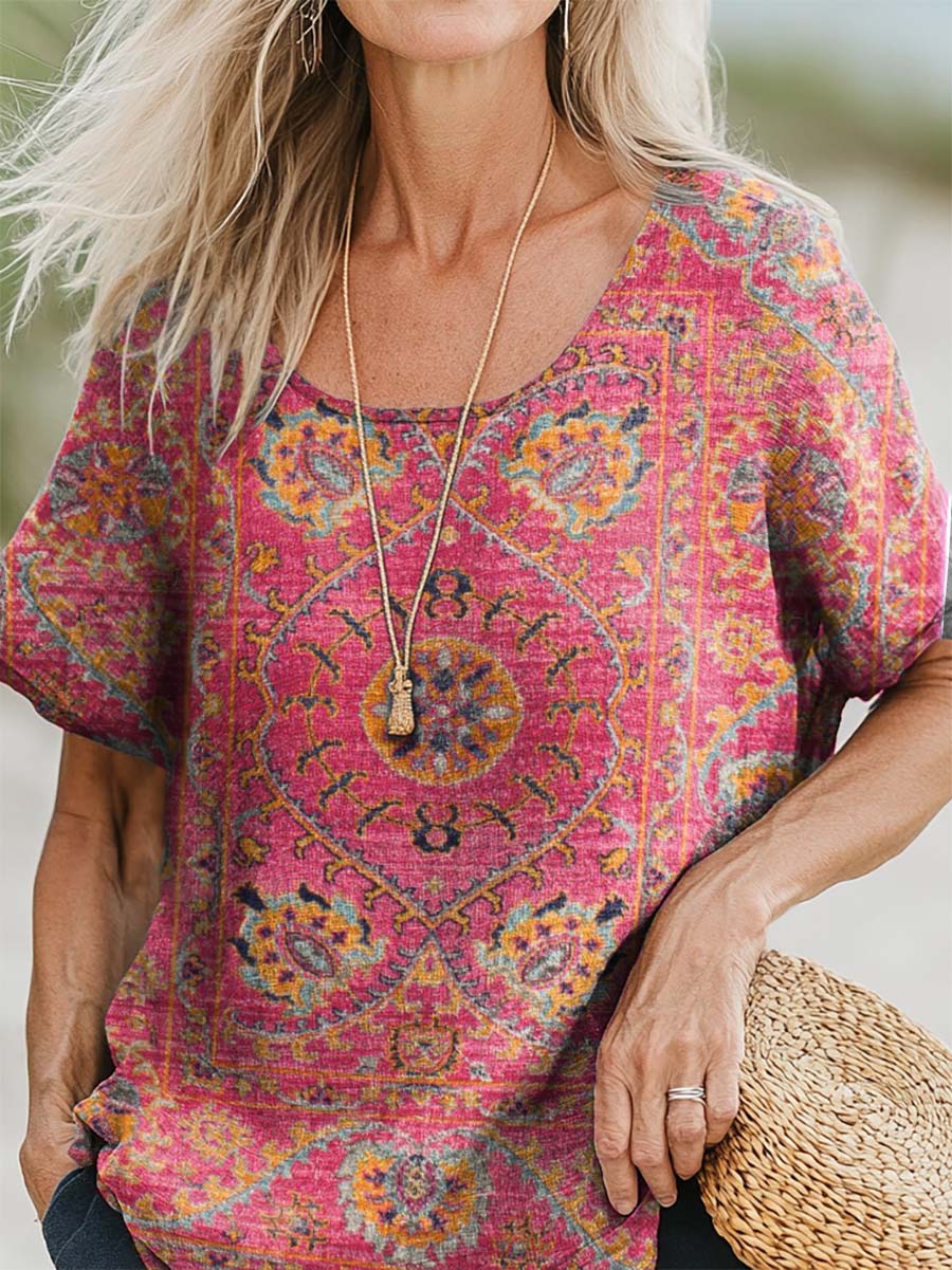 Women's Vintage Floral Totem Print Casual Cotton And Linen 3/4 Sleeve Shirt