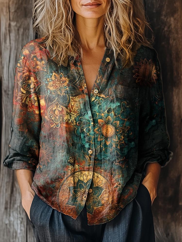 Women's Vintage Mandala Art Print Casual Long Sleeve Cotton Shirt
