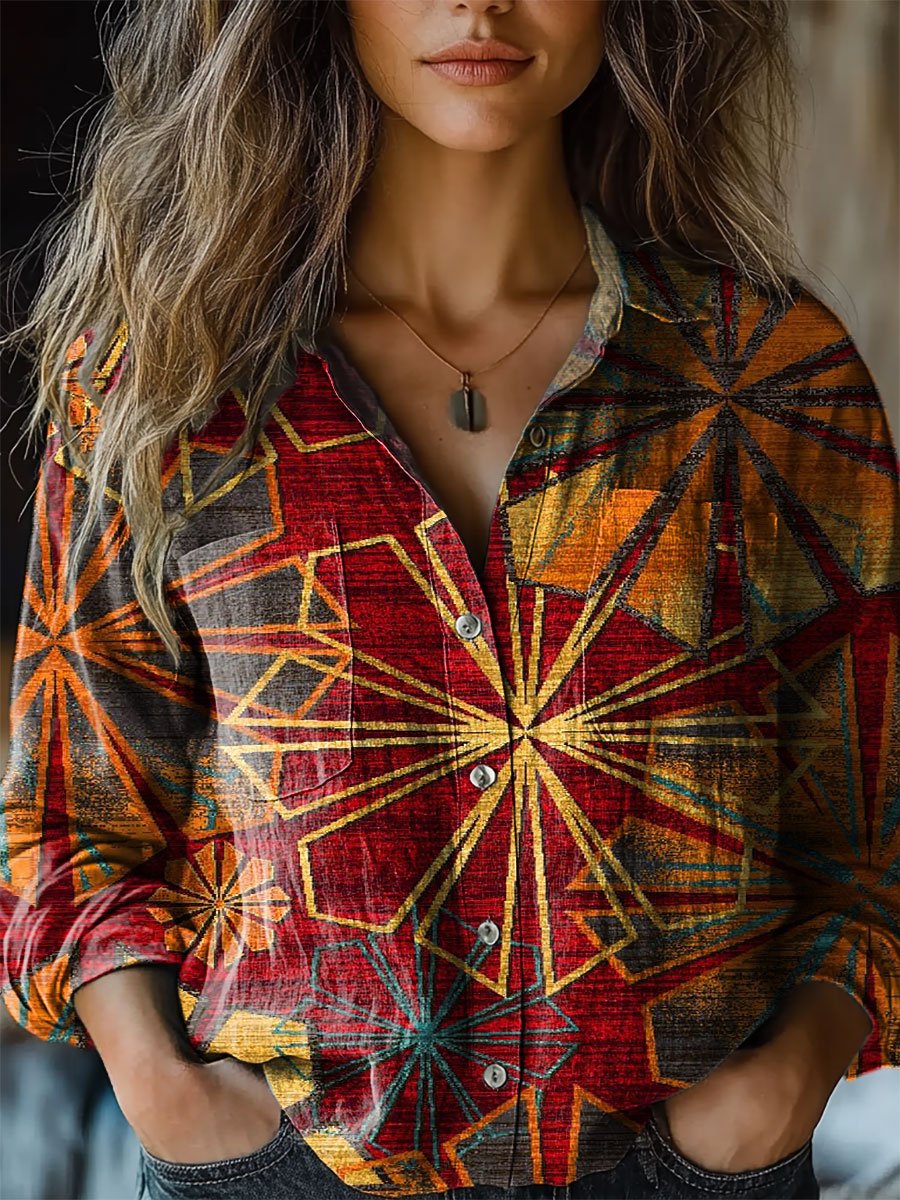 Women's Vintage Square Flower Art Print Casual Long Sleeve Comfortable Cotton Shirt