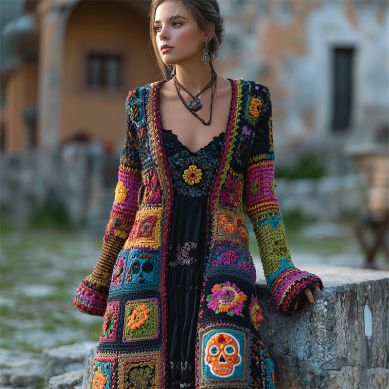 Day Of The Dead Sugar Skull Crochet Long Knit Cardigan