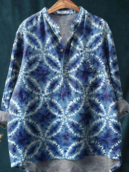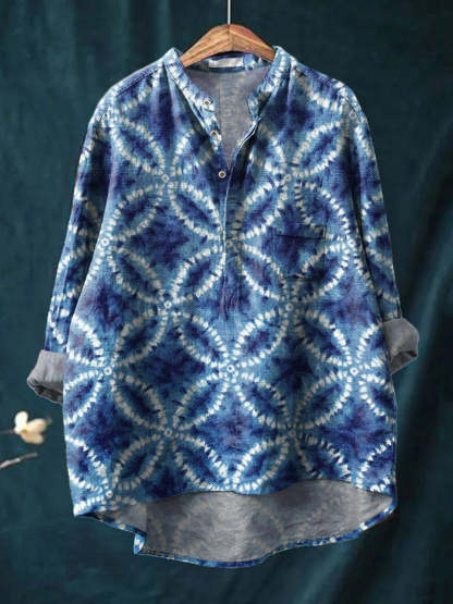 Geometric Shibori Tie Dye Pattern Printed Women's Casual Long Sleeve Comfortable Cotton Shirt