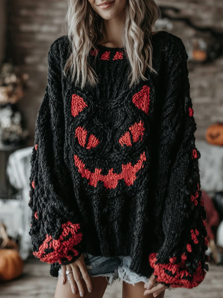 Halloween Black Smiley Face Contrast Knitted Cozy Sweater