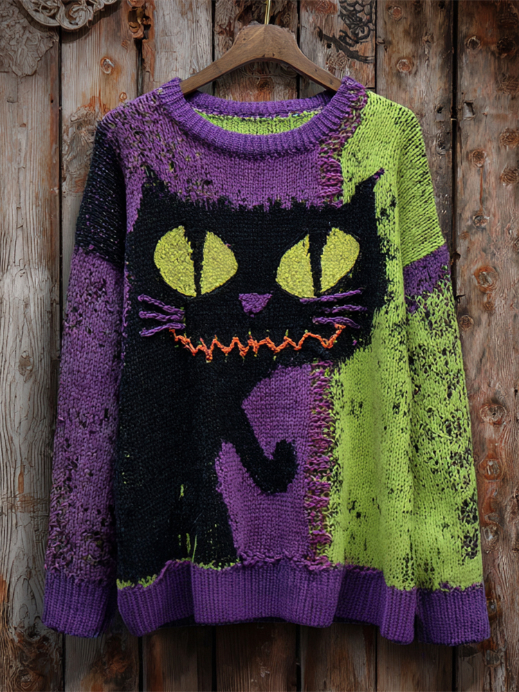 Halloween Cute Black Cat Color Blocking Women's Knitted Sweater