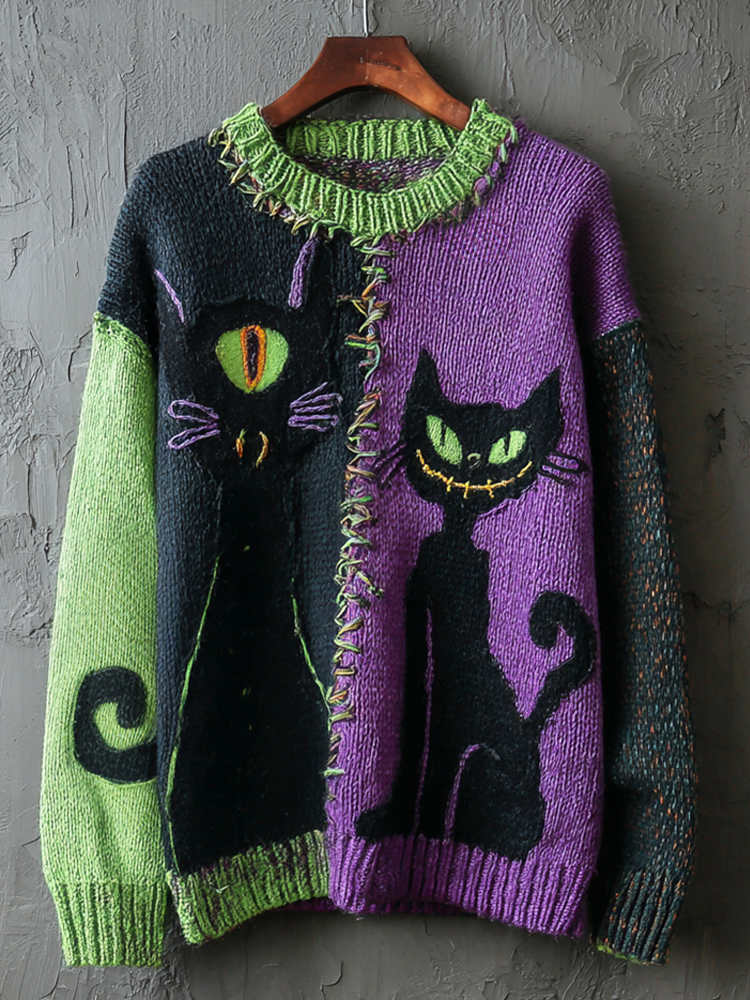 Halloween Monster Black Cat Color Blocking Women's Knitted Sweater