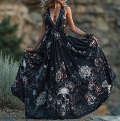 Halloween Skeleton And Rose Pattern Printed Women's V-neck Sleeveless Dress