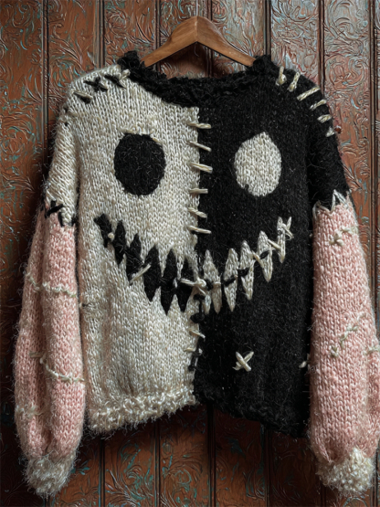 Halloween Spook Faces Contrast Color Stitched Cozy Fuzzy Sweater
