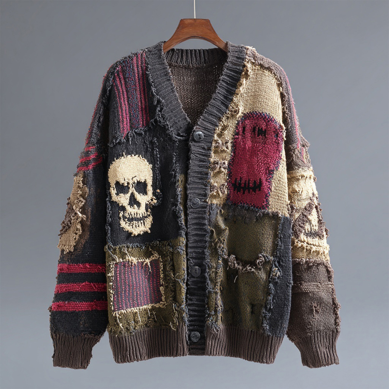 Halloween Vintage Skull Patchwork V Neck Cozy Cardigan