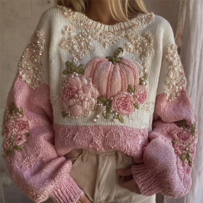 Thanksgiving Pumpkin Pink Floral Beaded Contrast Cozy Knit Sweater