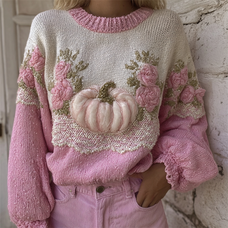 Thanksgiving Pumpkin Pink Floral Lace Contrast Cozy Knit Sweater