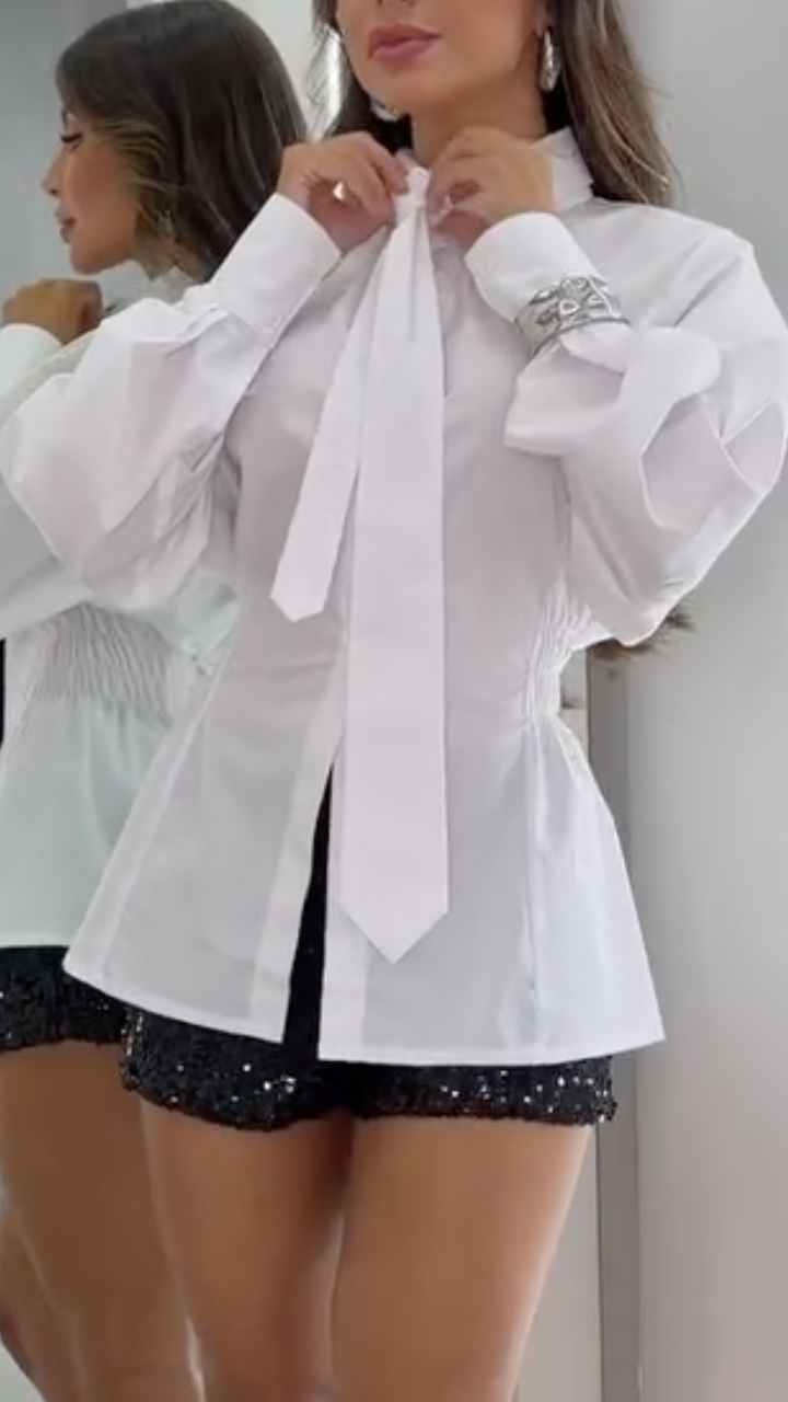 - Shirt: A classic button-down shirt with a pointed collar, dramatic puff sleeves, and a ruched waist detail that cinches your figure, creating a feminine, hourglass silhouette. The oversized, shirt-dress length adds a chic, effortless vibe.