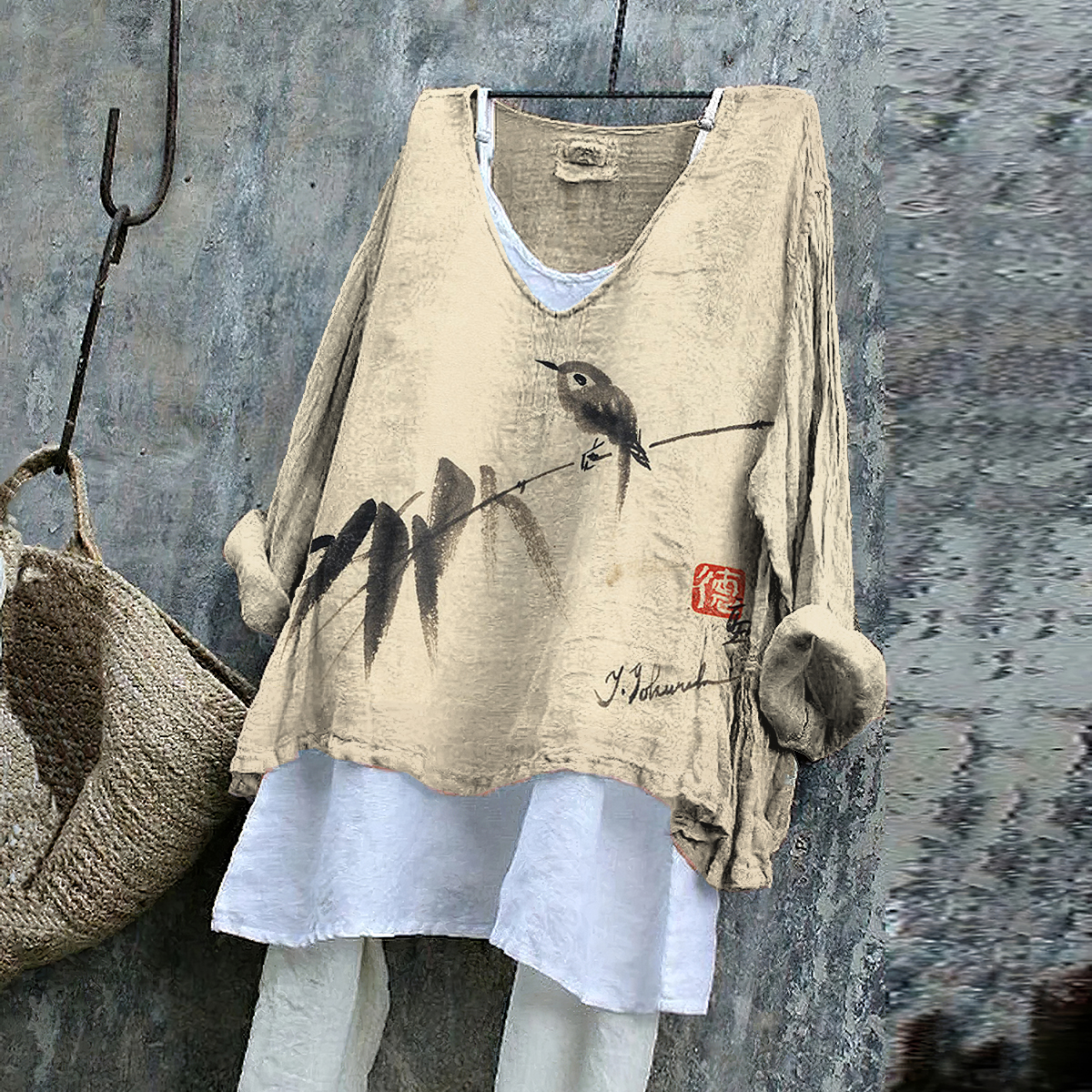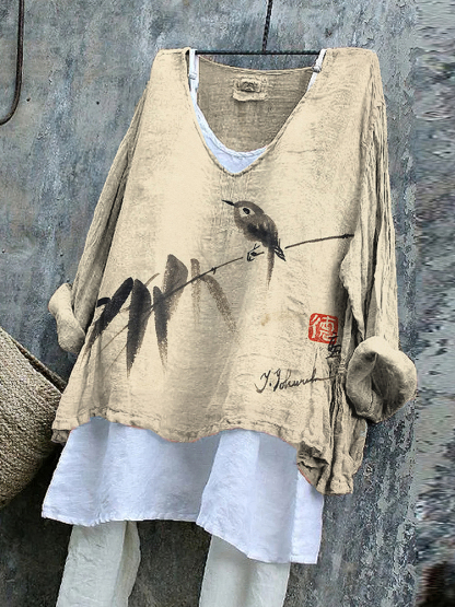 Vintage Birds Bamboo Ink Style Art Cotton Linen V Neck Casual Shirt