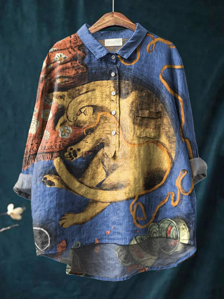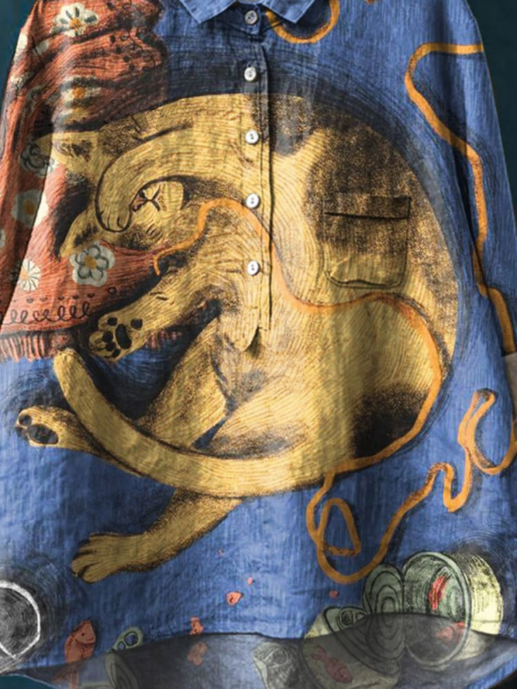 Vintage Lovely Cat Art Print Casual Cotton And Linen Shirt