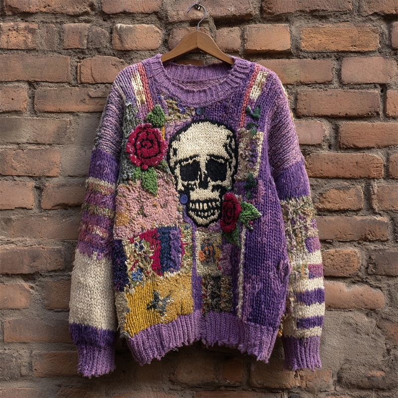 Vintage Skull & Roses Embroidered Patchwork Cozy Sweater