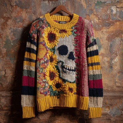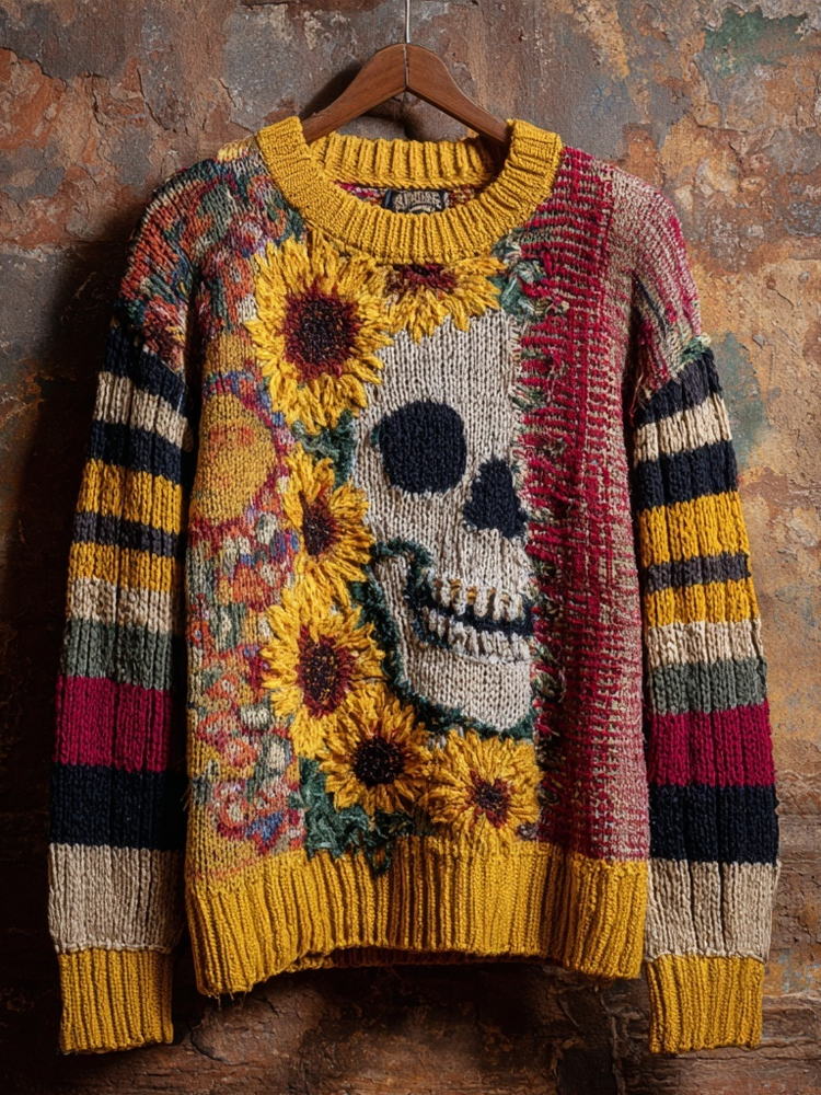 Vintage Skull & Sunflowers Embroidered Patchwork Cozy Knitted Sweater