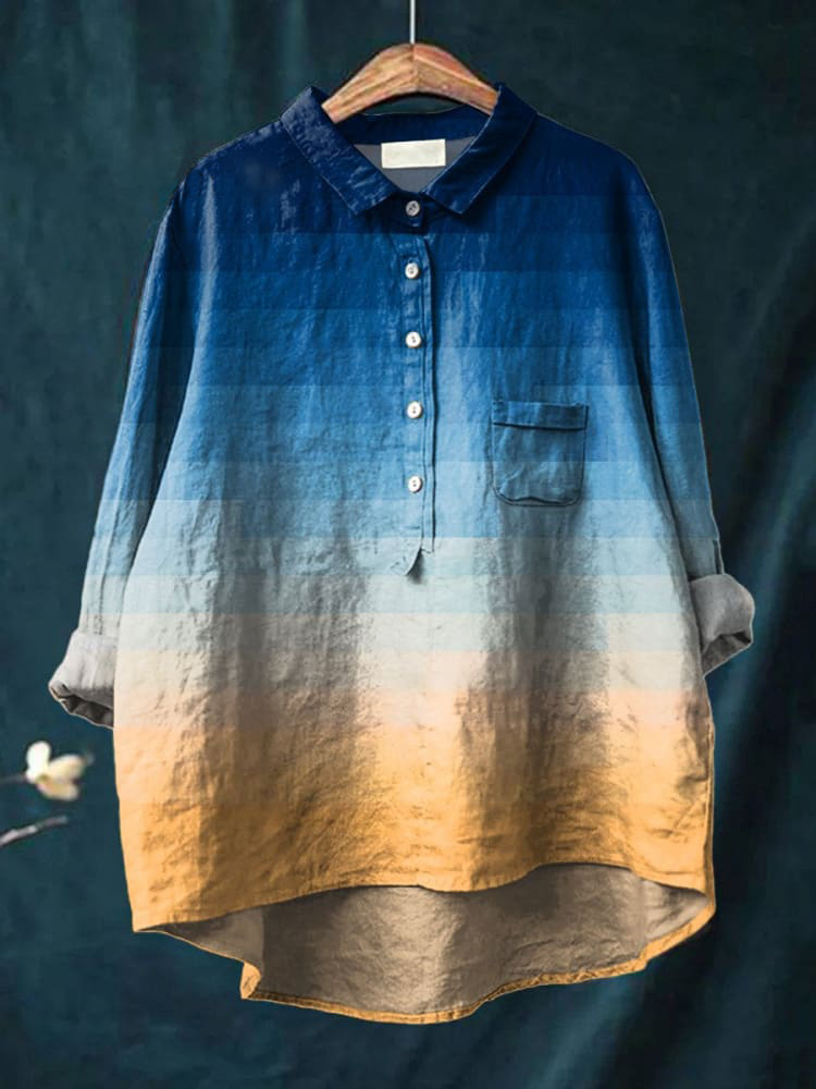 Women's Blue Yellow Ocean Sunset Art Mosaic Gradient Art Print Casual Cotton And Linen Shirt