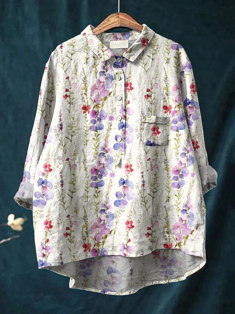 Women's Floral Art Print Casual Cotton And Linen Shirt