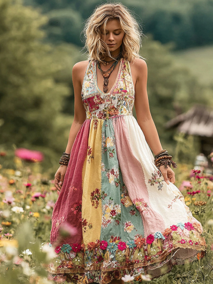 Women's Holiday Embroidered Floral Patchwork Maxi Dress