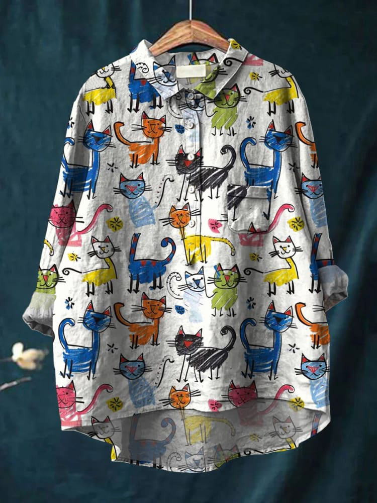 Women's Kid Drawing Cat Art Print Casual Cotton And Linen Shirt