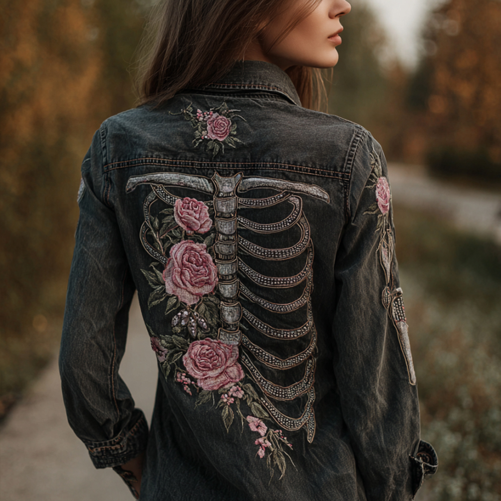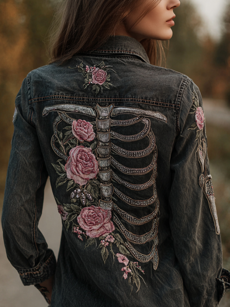 Women's Skeleton Flower Casual Lapel Long-sleeved Shirt
