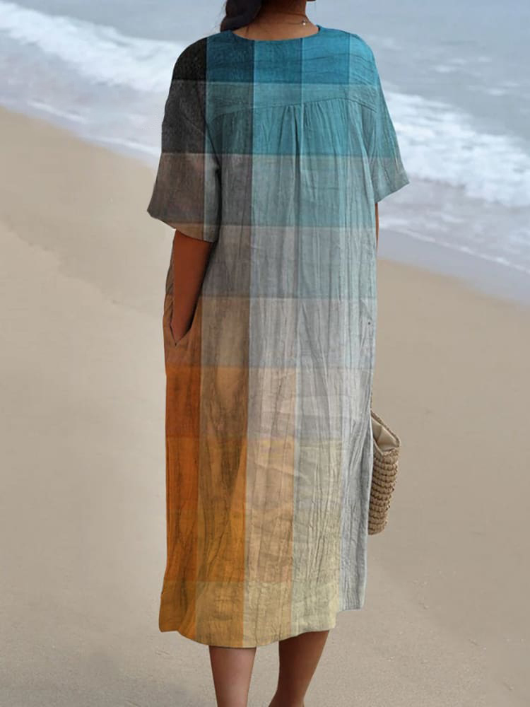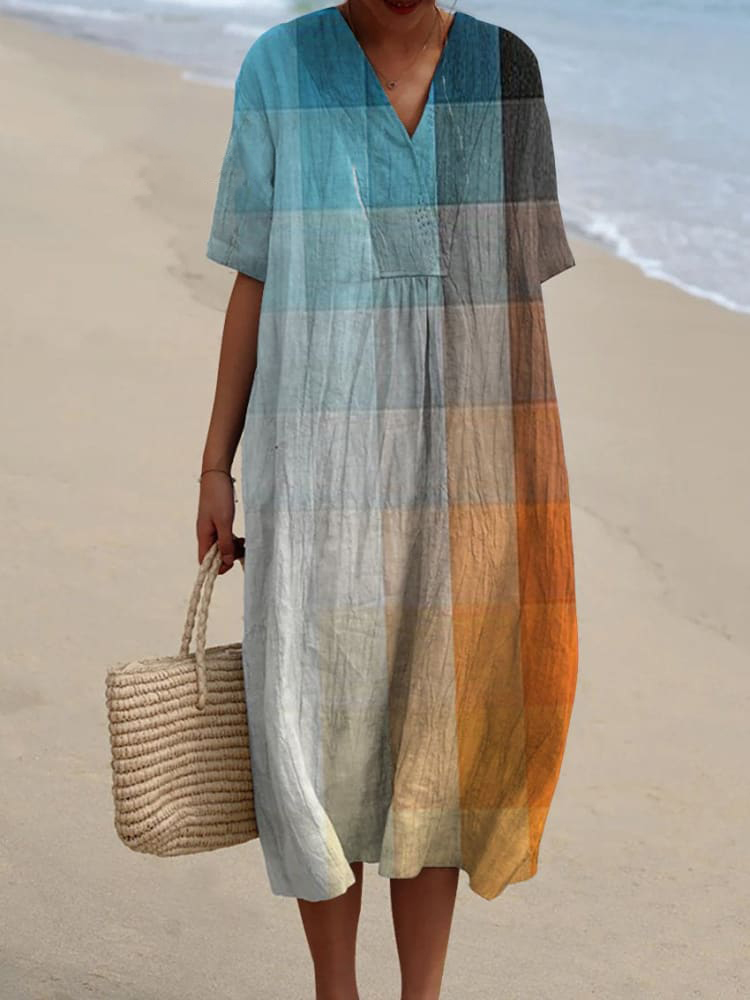 Women's V Neck Vintage Orange Blue Art Mosaic Gradient Art Linen Loose Dress