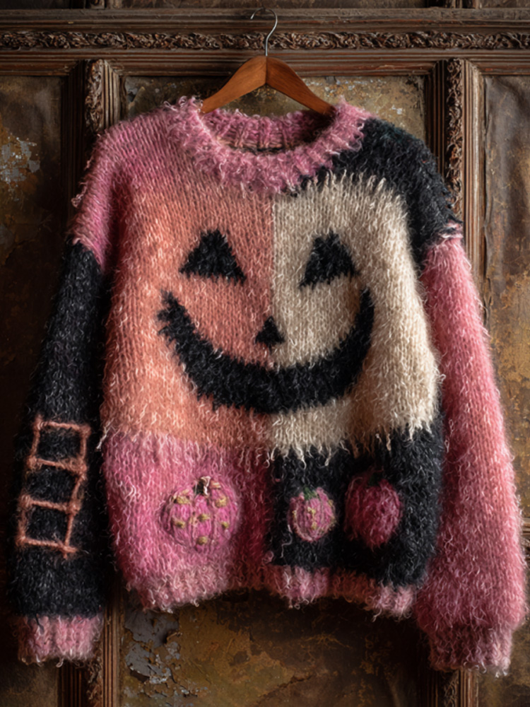 Women's Vintage Halloween Pink Ghost Face Knit Sweater
