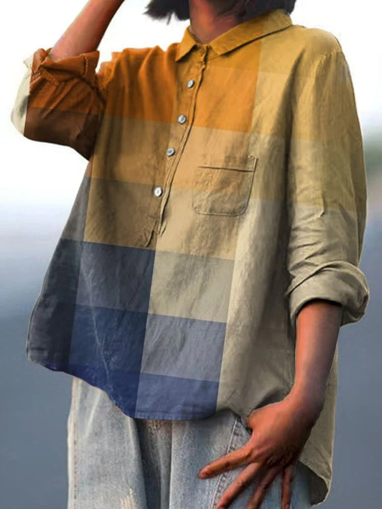 Women's Yellow Blue Art Mosaic Gradient Art Print Casual Cotton And Linen Shirt