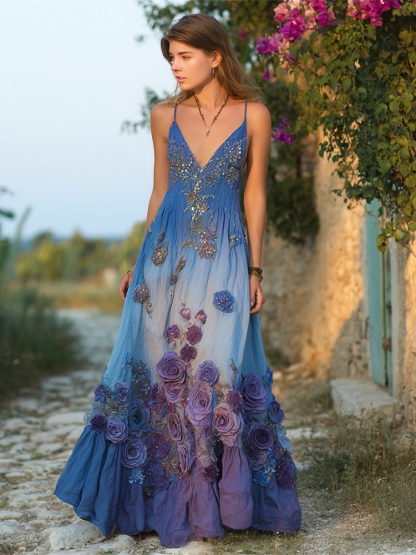 Boho Vintage Floral Embroidery Gradient Women's V-neck Spaghetti Straps Flowy Maxi Dress