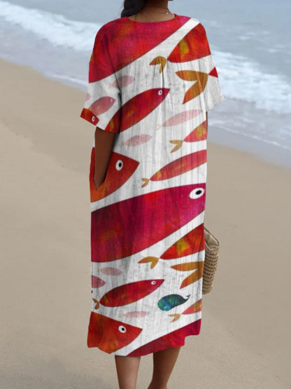 Decorative Pattern of Red Fish Swimming Diagonally Upwards Flowy Dress