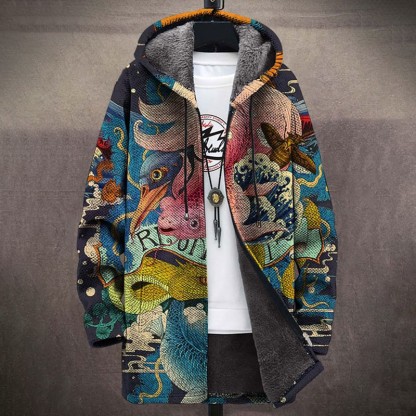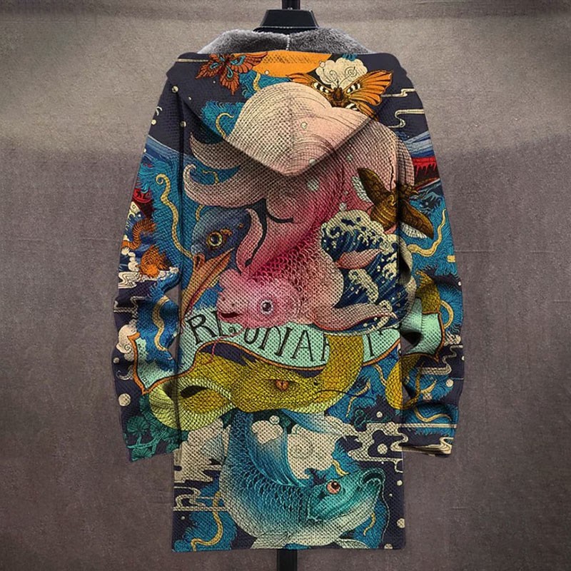 Retro Japanese Ocean Fish Insect Print Unisex Plush Thick Long-sleeved Fleece Jacket