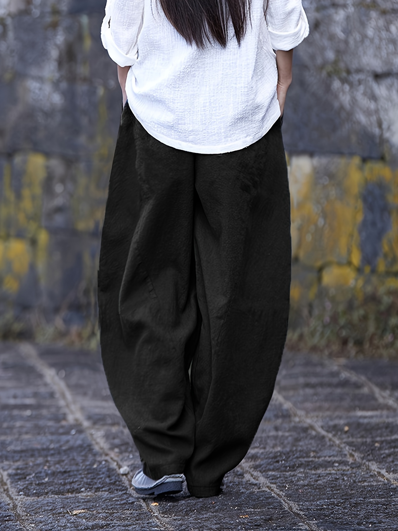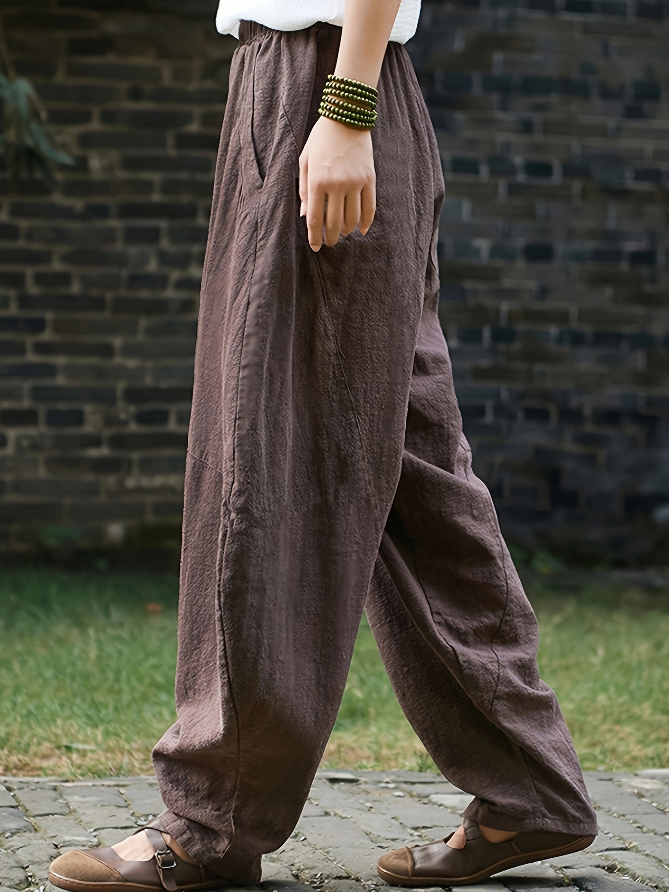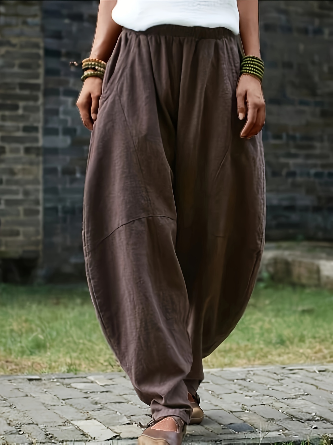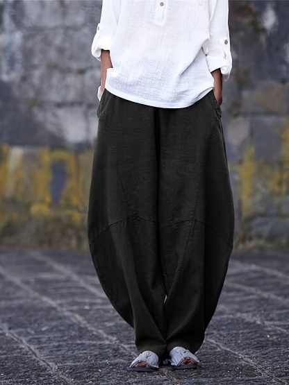 Solid Elastic Waist Baggy Pants, Casual Pocket Harem Pants For Spring & Summer, Women's Clothing