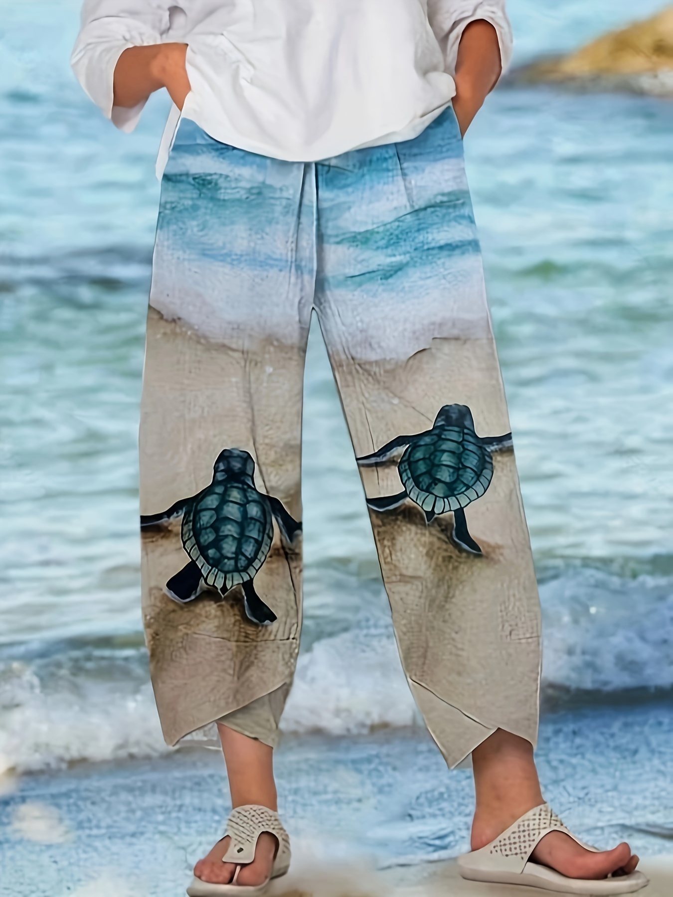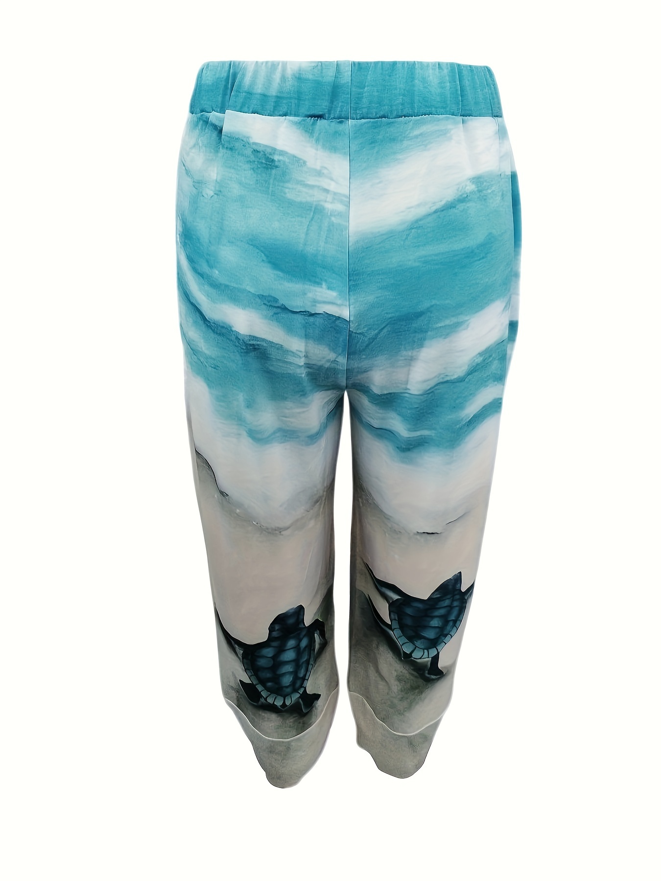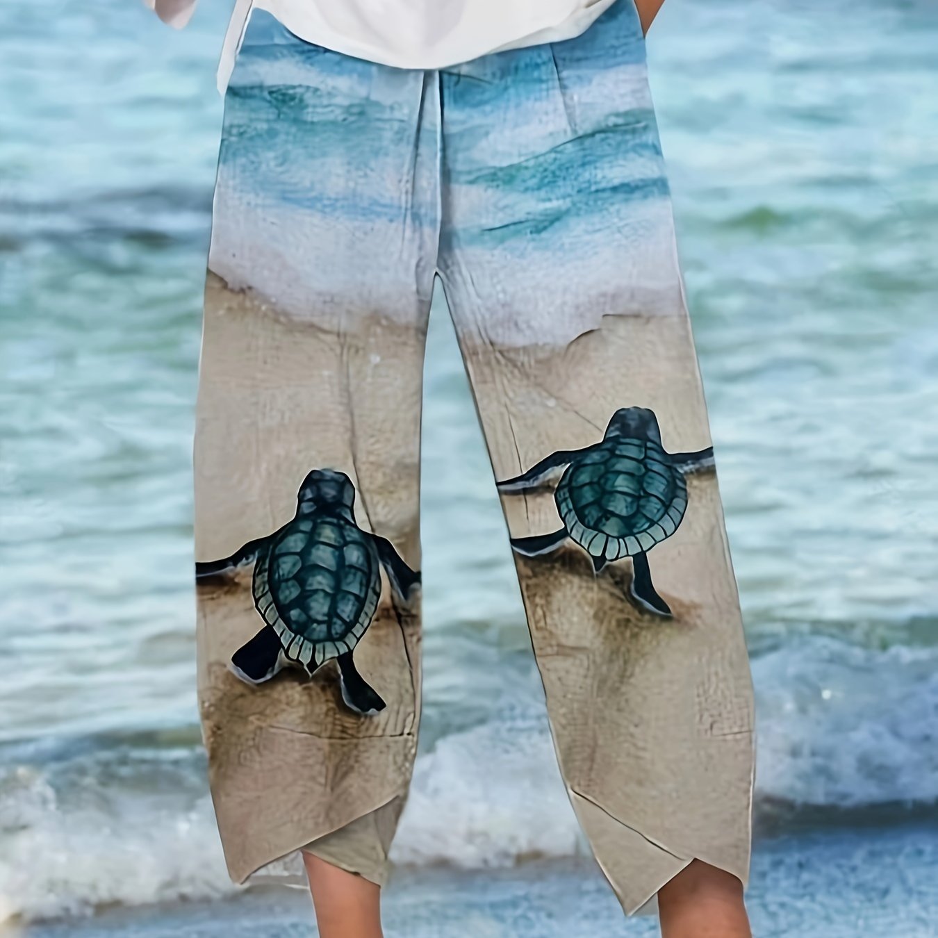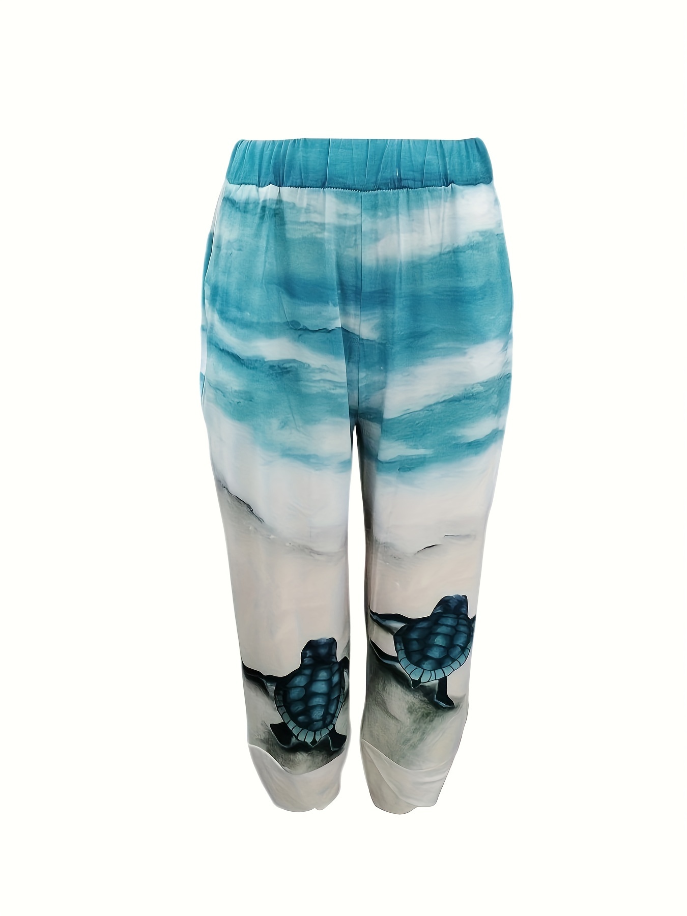 Turtle Print Straight Leg Pants, Casual Asymmetric Hem Pants For Spring & Summer, Women's Clothing