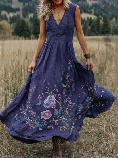 Vintage Purple Floral Embroidered Sleeveless Maxi Dress