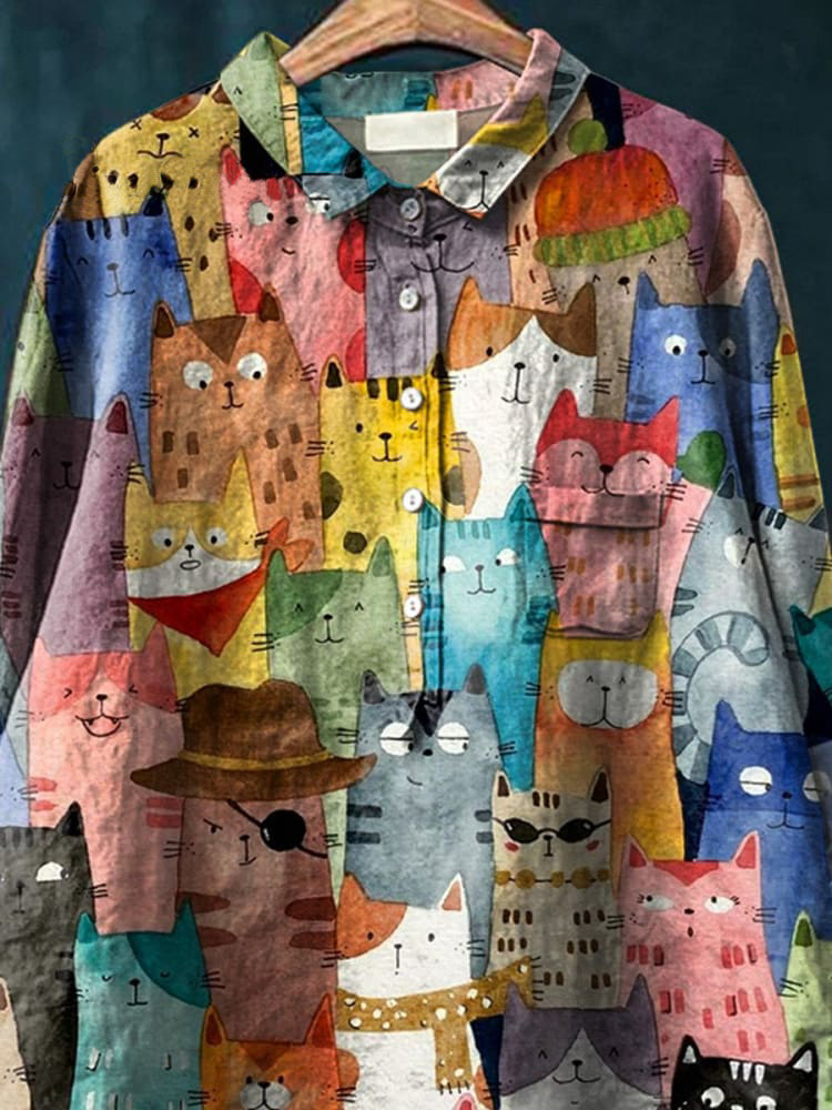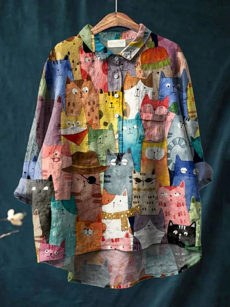 Watercolor Cute Cats Repeat Pattern Printed Women's Casual Cotton And Linen Shirt