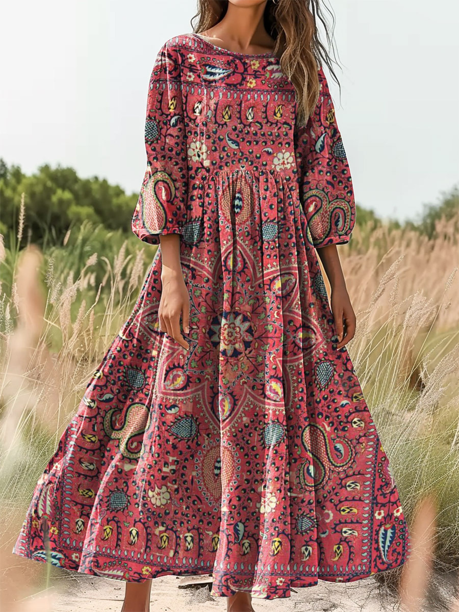Women's Bohemian Floral Art Print Flowy Crew Neck Cotton Pocket Dress