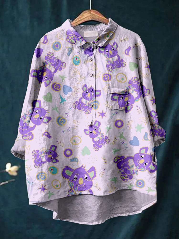 Women's Cartoon Printed Casual Cotton And Linen Shirt