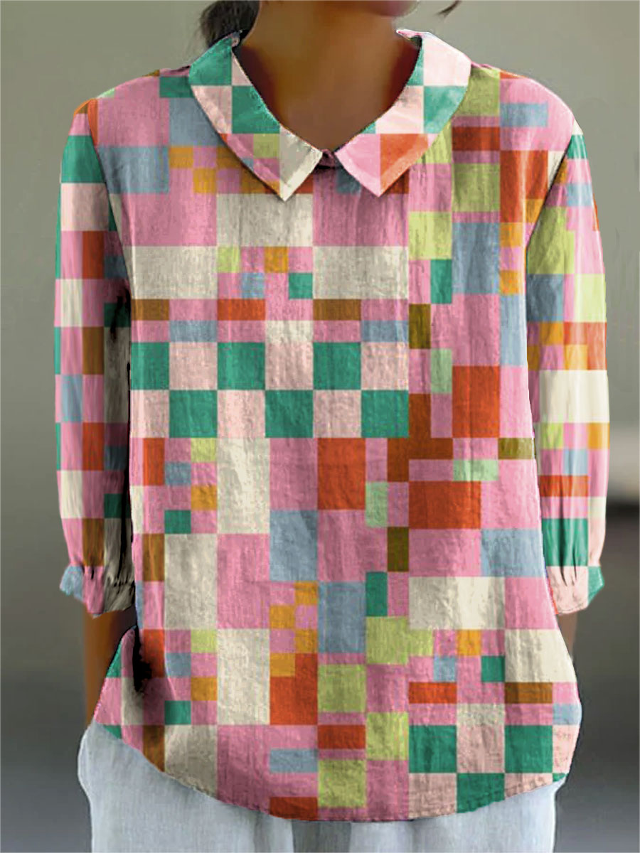 Women's Color Block Plaid Art Print Casual Cotton And Linen 3/4 Sleeve Shirt
