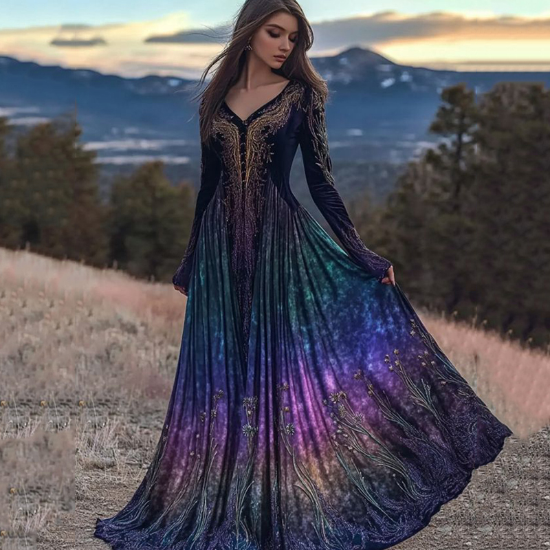 Women's Viking Purple Gradient Pattern V Neck Maxi Dress