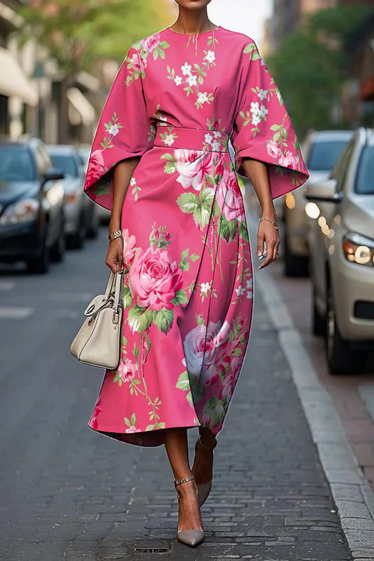 Women's Vintage Elegant Pink Rose Floral Print Midi Dress