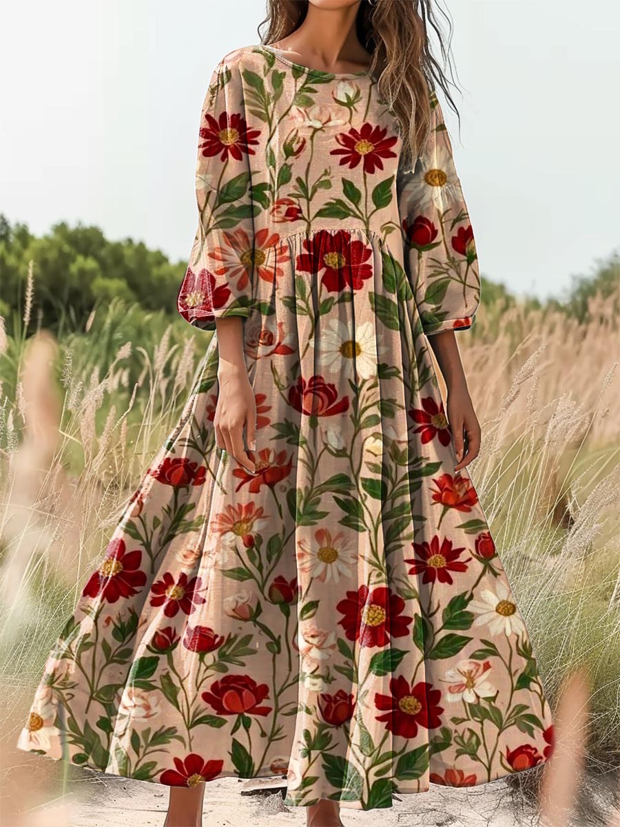 Women's Vintage Folk Floral Art Print Crew Neck Pocket Cotton Dress