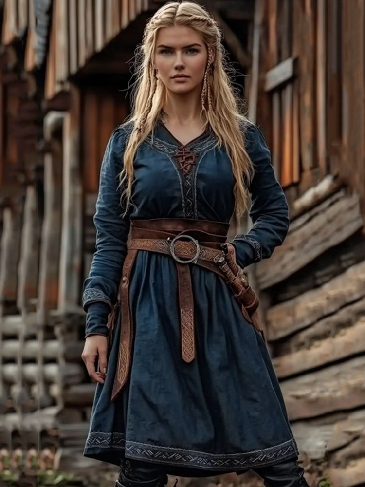 Womens Vintage Viking Tribal Celtic Design V Neck Linen Dress