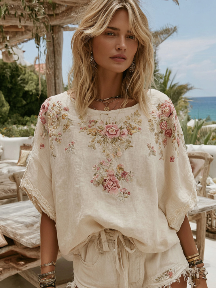 Women's Vintage Floral Embroidery Art V Neck Linen Comfy T-shirt