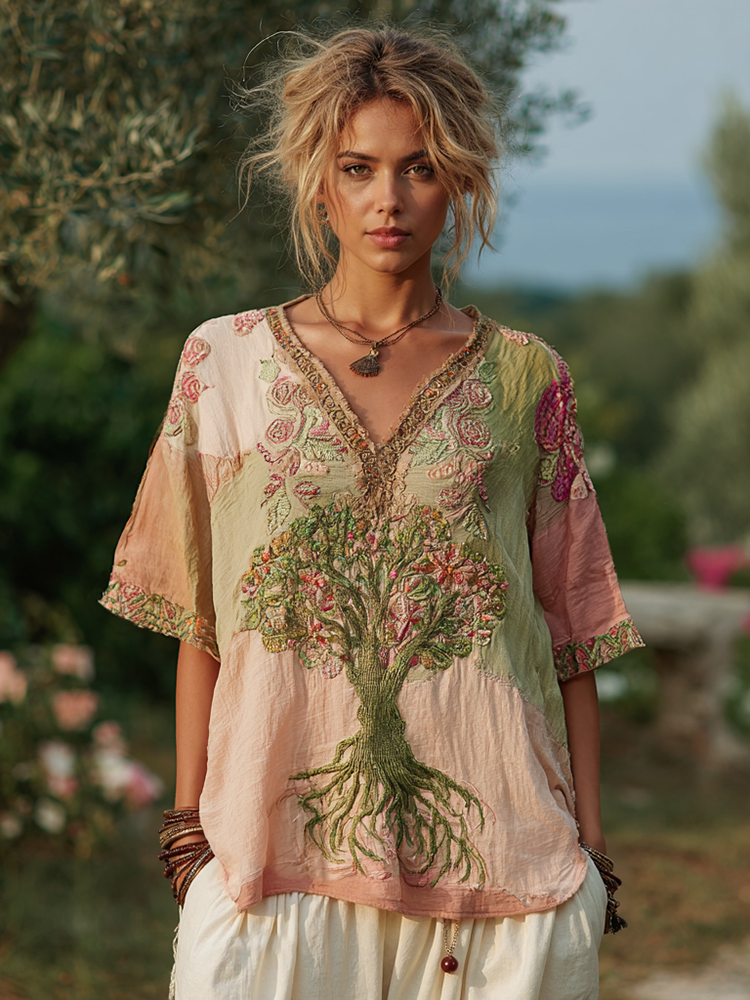 Vintage Embroidered Tree Of Life Flowers V-neck T-shirt
