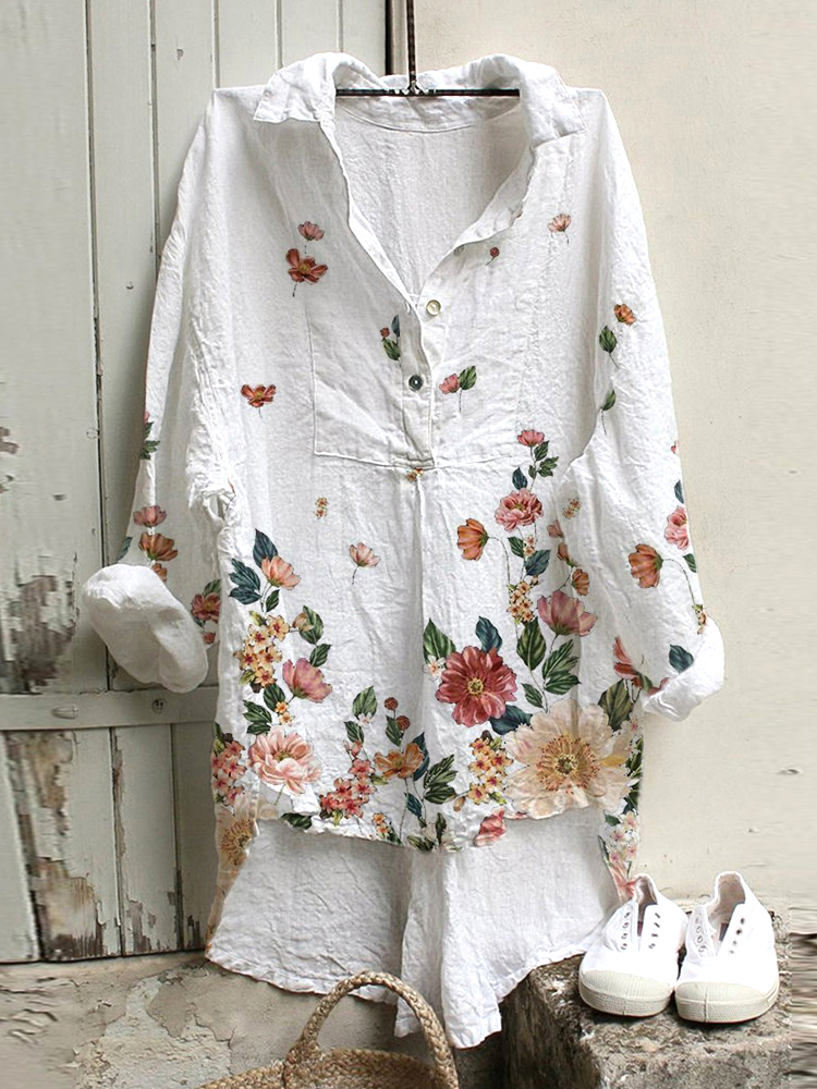 Floral Pattern Ladies Casual Floral Print Cotton Linen Shirt