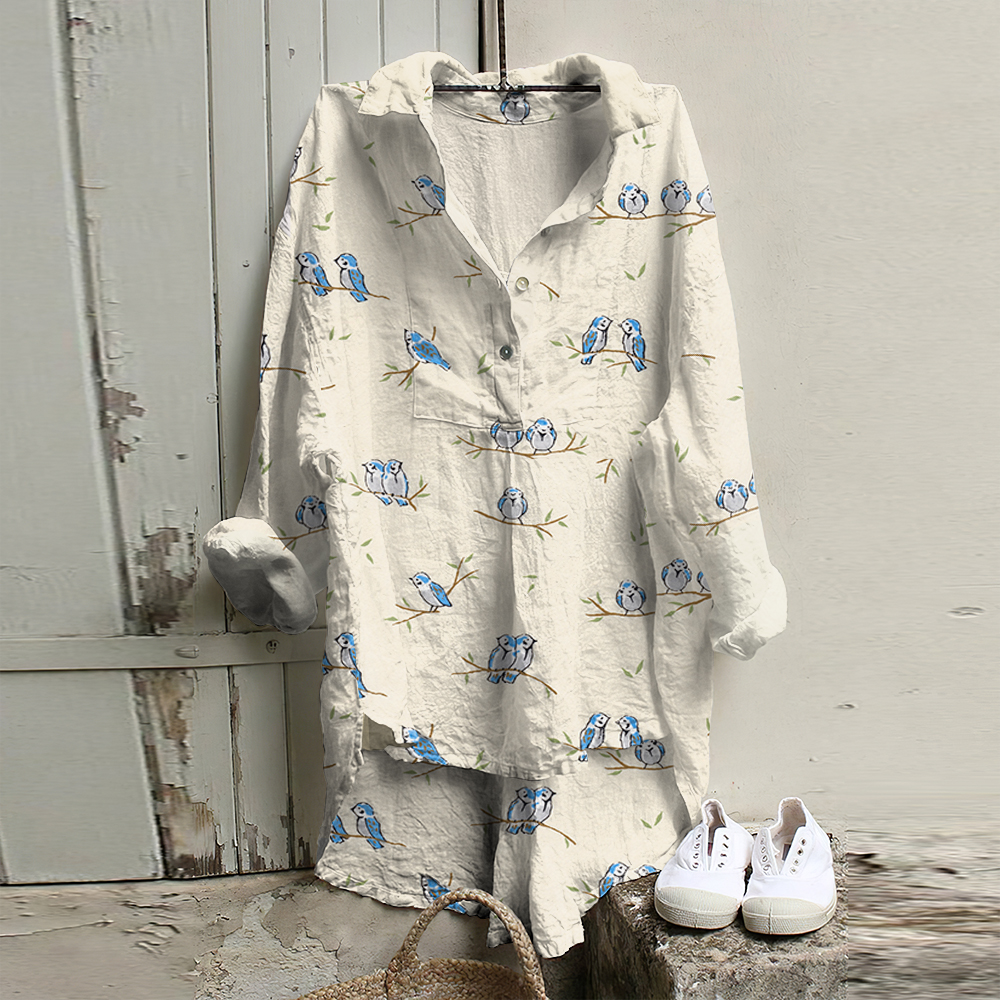 Cozy Bird Plant Art Cotton Blend Casual Long Sleeve Shirt
