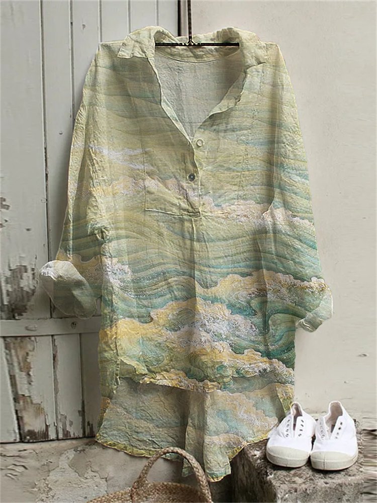 Sea Waves Japanese Art High Low Linen Blend Tunic