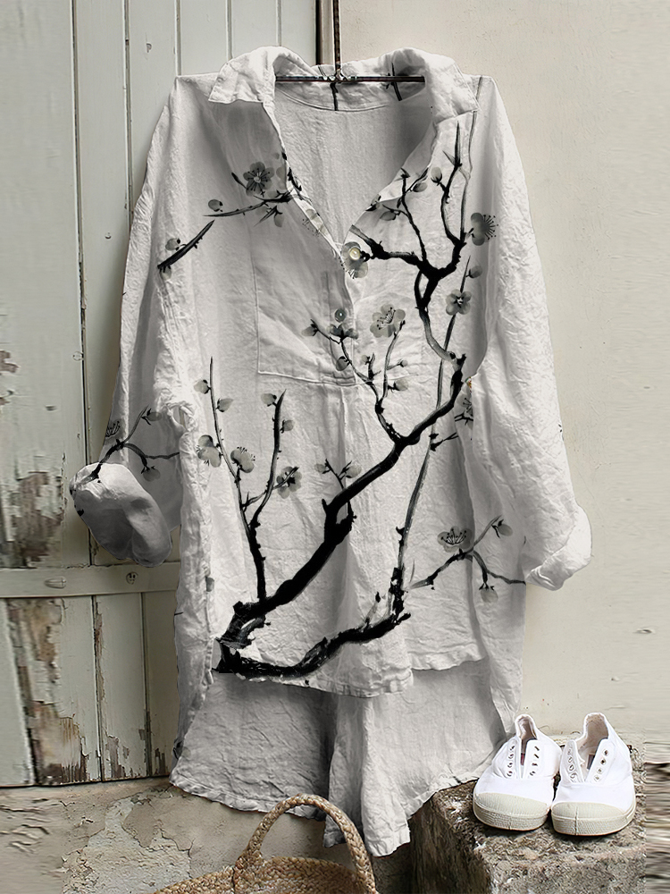 Vintage Japanese Art Branch Cotton Linen V Neck Comfy Shirt