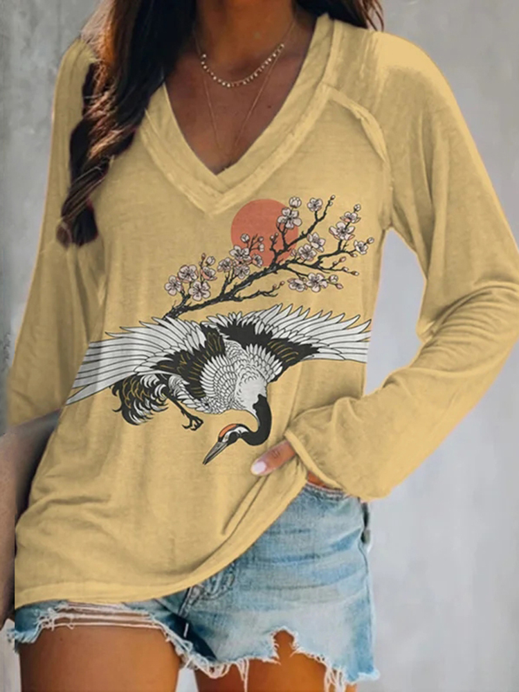 Women's Japanese Cranes Cherry Blossoms Print V Neck Long Sleeve T-Shirt