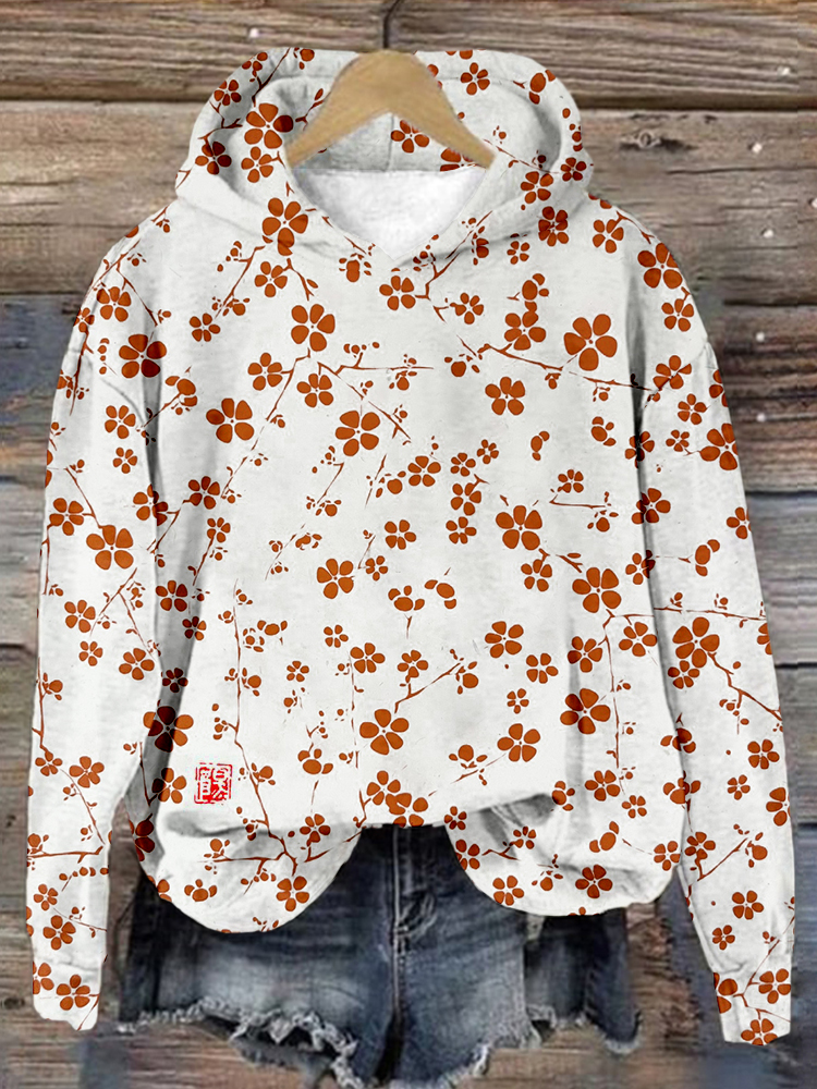 Plum Blossom Japanese Lino Art Cozy Hoodie