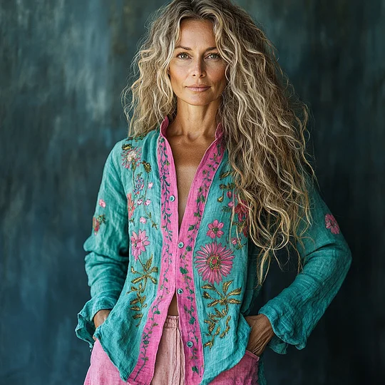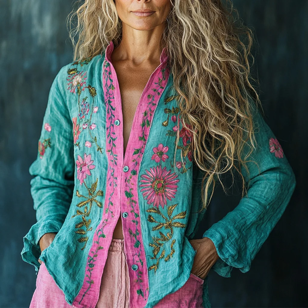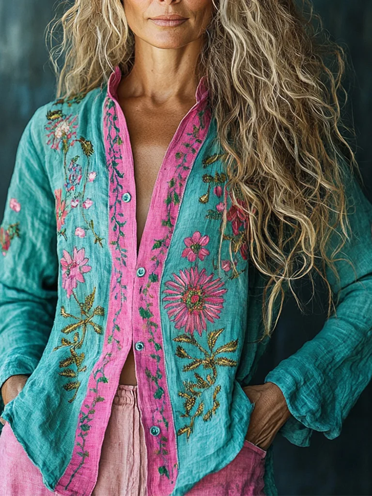 Bohemian Holiday Style Linen Floral Print Long Sleeve Shirt